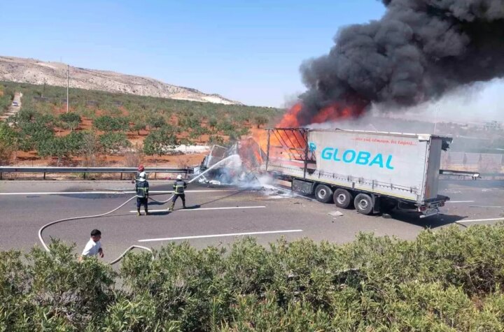 Gaziantep-Nizip otoyolunda park halindeki bir tıra çarpan tır alev topuna döndü. Kazada tır şoförü...